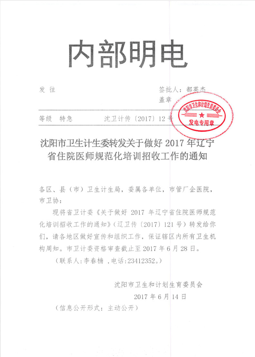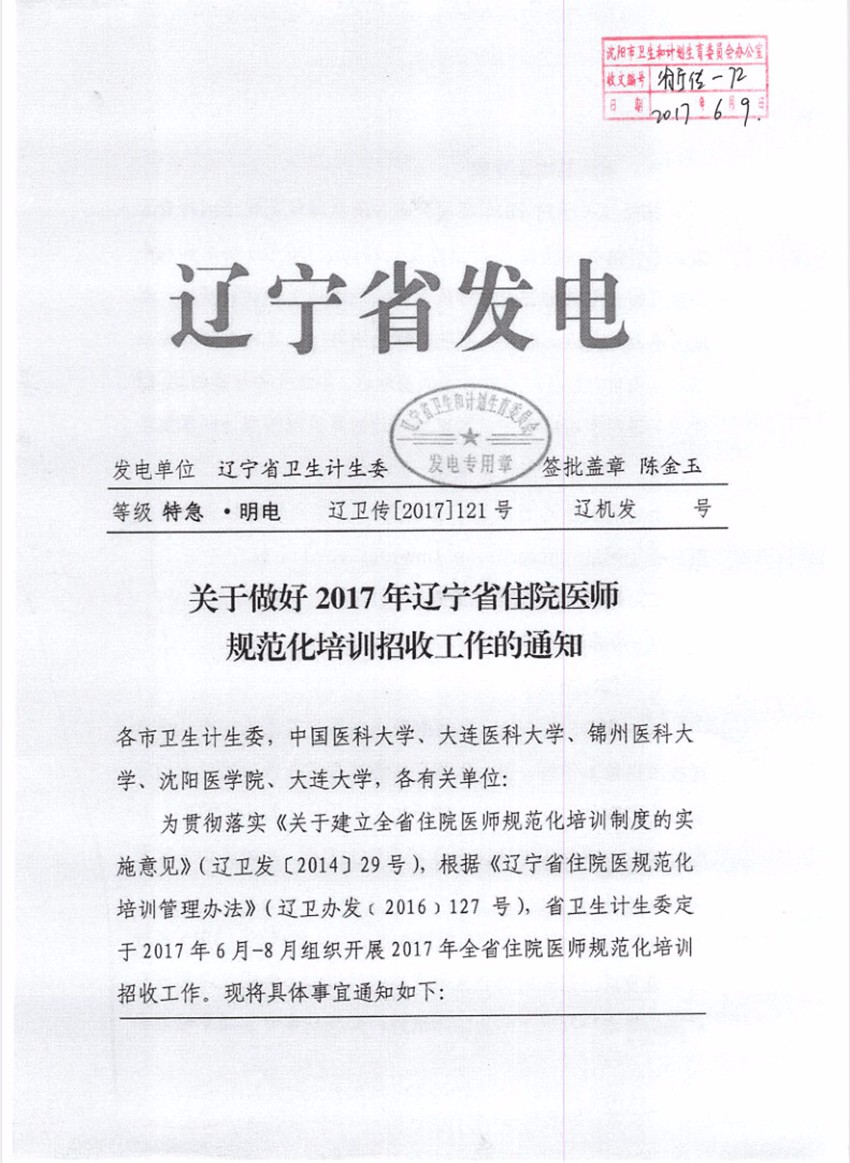沈阳市卫生计生委转发关于做好2017年辽宁省住院医师规范化招收工作的通知 2017-06-14 由于文章过大,详情请下载附件查看:沈阳市卫生计生委转发关于做好2017年辽宁省住院医师规范化招收工作的通知.pdf 上一篇:市儿童医院组织住院医师规范化培训学员最新版心肺复苏技能培训 下一篇:关于举办2017年辽宁省住院医师规范化培训专业基地师资培训班的通知